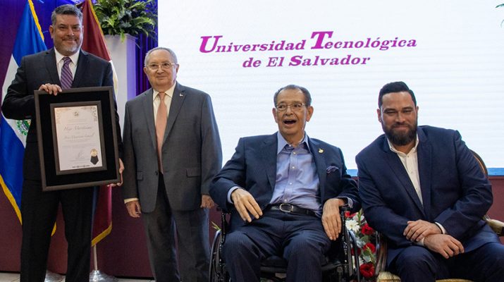 El reconocimiento fue entregado por el alcalde de la capital salvadoreña, Mario Durán, quien destacó la visionaria apuesta que siempre ha tenido el rector