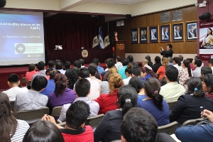 Al dirigirse al auditorio abarrotado de estudiantes la directora de la escuela de negocios, Reyna Quintanilla, destacó que estas actividades son pensadas para dar un valor agregado al proceso formativo de los jóvenes que estudian esta carrera.