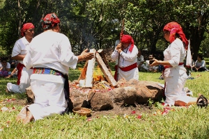 Dicho momento ceremonial está centrado en la invocación de abuelos, ancestros, dioses y la misma naturaleza que incluye cerros, volcanes, lagos, ríos y centros ceremoniales que en la medida que se invocan se realizan ofrendas al fuego, mismas que pueden ser cacao, mirra, incienso, candelas, puros, madera de ocote, entre otros.