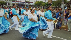 “Son alrededor de 60 estudiantes los que están desfilando, orgullosos de participar. Ya son tres años de venir y estamos contentos”, afirmó el docente Edwin Soriano, quien orientaba a los jóvenes con capacidades especiales para seguir los pasos del baile folclórico.