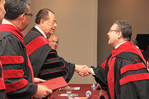 “Quiero agradecer al directorio ejecutivo de la universidad, en mi nombre, en el de mi familia, en el de mis compañeros y todos aquellos que participaron en mi formación personal y profesional”, indicó el rector frente a la multitud que escuchó sus palabras tras recibir la honorífica distinción.