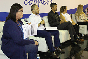 La directora de la referida unidad, Blanca Ruth Orantes y un profesional que fue beneficiario del sistema de becas de movilidad estudiantil en un país europeo, participaron de un foro especializado que se realizó en el marco de la feria Europa Coopera.