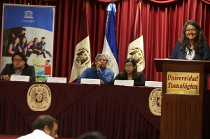 Para profundizar en el análisis de la temática se contó con la participación del director nacional de patrimonio cultural, Marlon Escamilla; la especialista del sector cultura de la oficina multipaís de la UNESCO, en San José, Costa Rica, Montserrat Martell; y la secretaria de cultura, Silvia Elena Regalado, quienes compartieron su particular visión en ese tema ante un grupo de estudiantes, invitados especiales y académicos.