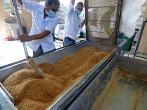 Esta maquinaria es similar a la que tienen en los ingenios sólo que en tamaño más pequeño, añadió. “Para terminar el proceso de extracción de la panela granulada se hace únicamente a través de vapores, cuando se extrae la miel crujiente, así como en la molienda, ésta es puesta a enfriar removiéndola con unas paletas hasta que cristalice, luego se cuela hasta que queda la panela granulada lista para embolsar. Los embazados pueden ser diferentes, esto dependiente de cómo lo quiere el cliente”, explica Vilma.